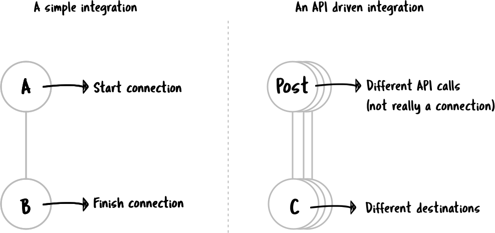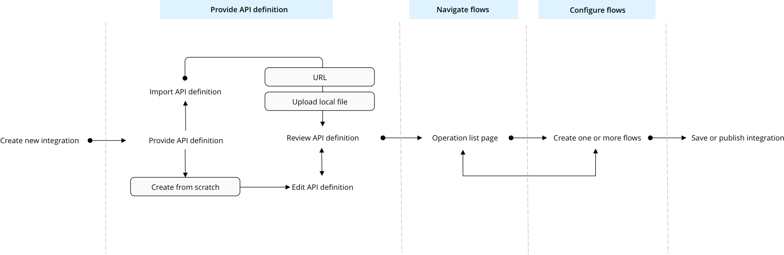 Letting users create an integration that starts with API calls brings complexity to the existing workflow as one integration could now contain multiple execution flows based on the operations defined in an API document. In other words, it means an integration may have multiple start “connections”.